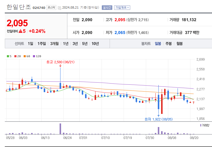 차트 상에서 한일단조의 주가는 6월 중순 최고점(2,580원) 이후 지속적으로 하락세를 보이고 있으며, 8월 초 최저점(1,922원)에서 약간 반등한 모습을 보입니다.
