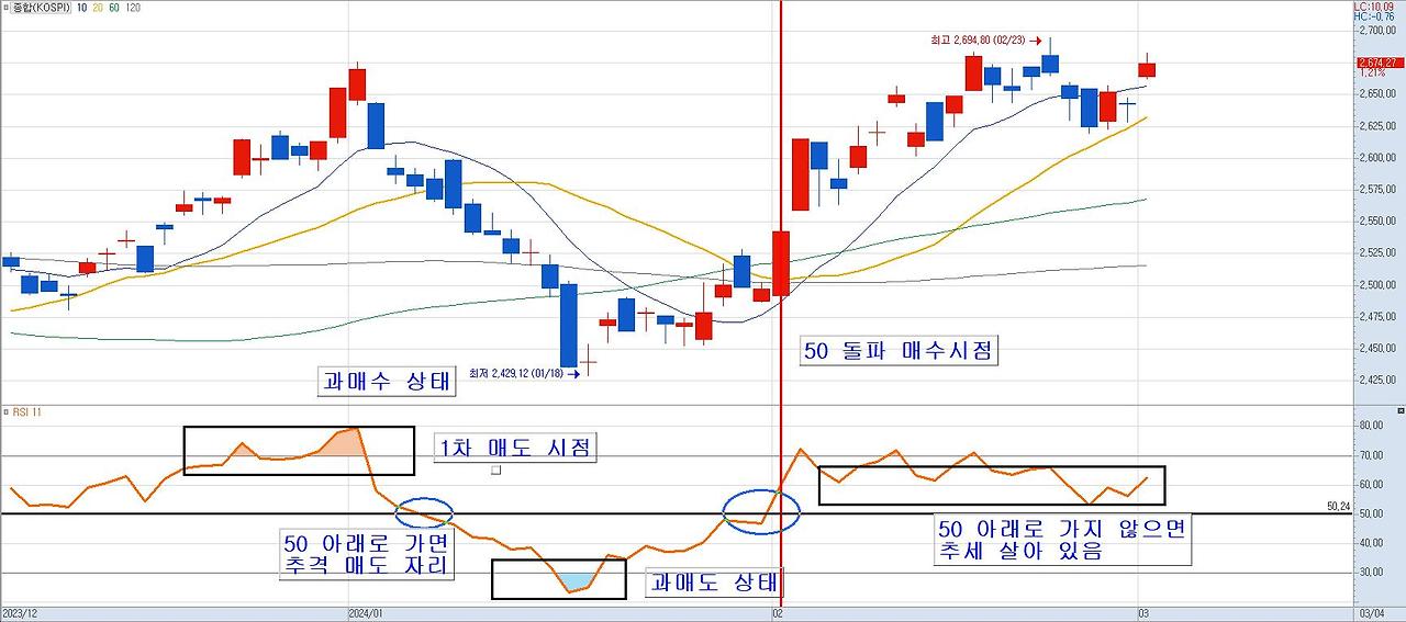 위에 차트는 코스피 일봉 차트입니다. RSI가 과매수 상태에서 70이하로 내려갈 때 1차 매도 시점입니다. 그리고 RSI가 50 아래로 내려가면 추격 매도해야 합니다. 이는 상승 추세가 깨졌다고 볼 수 있습니다. 그리고 RSI가 과매도 상태에서 벗어나 50을 돌파할 때 RSI로 매수 시점을 잡을 수 있습니다. 단 RSI로 매수 할 때 이평정배열인 상태나 20일 이평 위에 주가가 있을 때 매수하시기를 추천드립니다. 그리고 RSI 과매수 구간이 짧고 RSI가 50 밑으로 떨어지지 않았을 경우는 추세가 살아있는 것이기 때문에 계속 보유하는 것을 추천드립니다.