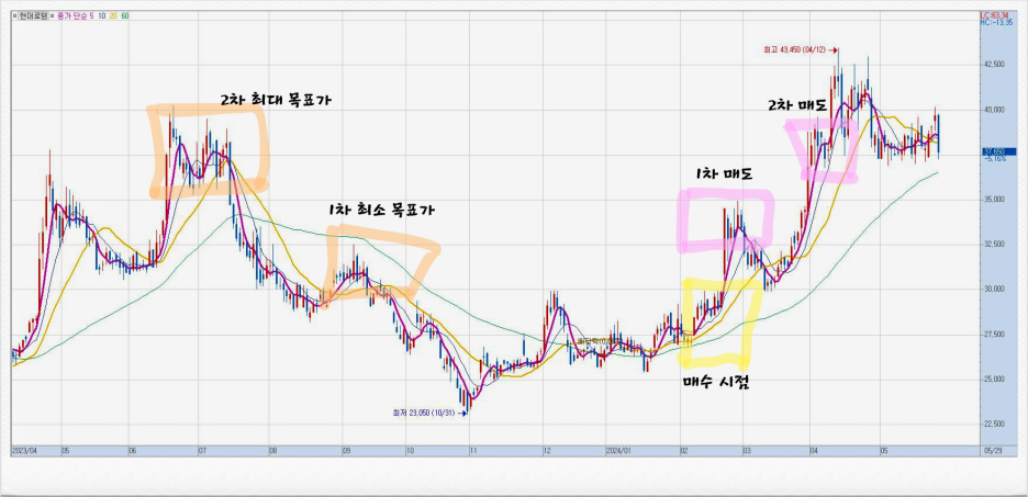 1차 최소 목표가에 도달했을 때 1차 매도하였고 2차 매도 시점을 2차 최대목표가 지점에 도달했을 때 매도하였습니다. 우리가 여기서 또 기억해야 할 것은 매수와 매도는 꼭 분할 매수 분할 매도로 해야 합니다.