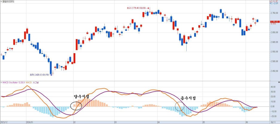 단기 지수이동평균이 장기 지수이동평균보다 위쪽에 위치하면 MACD선은 양수가 되고 이것은 주가가 상승하는 신호로 여겨집니다. 반대로 단기 지수이동평균이 장기 지수이동평균보다 아래쪽에 있으면 MACD 선은 음수가 되고 이것은 주가가 하락하는 신호로 여겨집니다.