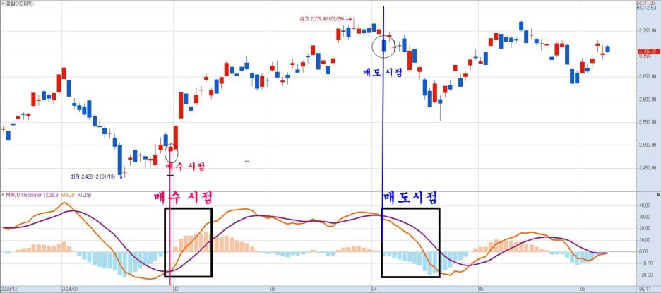 MACD = 12일 단기 지수이동평균 – 26일 장기 지수이동평균