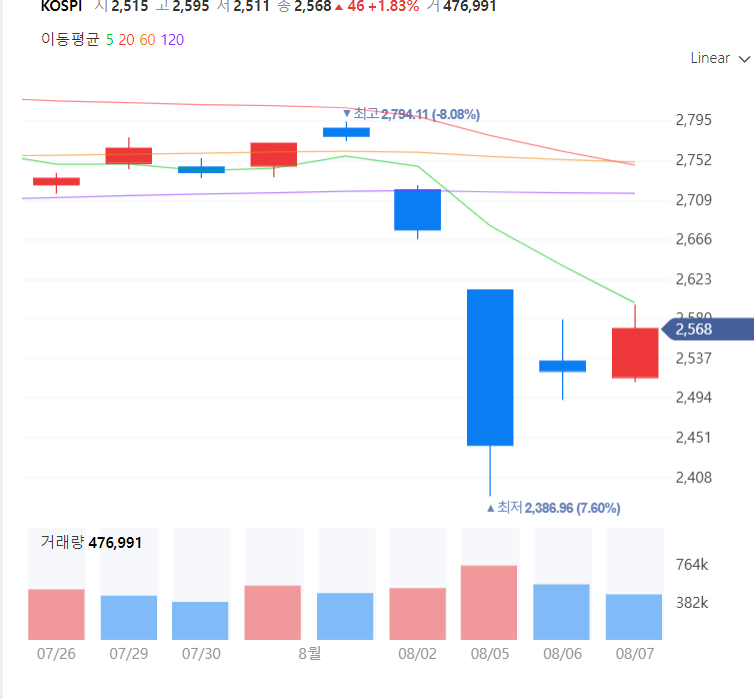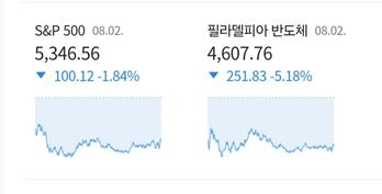 8월 2일 미국증시, 특히 필라델피아 반도체 지수가 -5.18% 폭락이 나오므로 우리나라 코스피는 8월 5일 -7.6% 하락하였습니다.