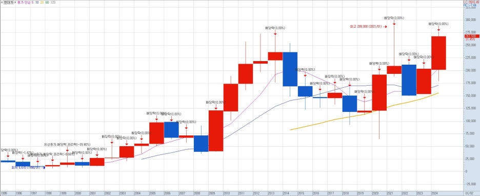 위에서 환율에 따른 수·출입 기업들의 이익과 주가의 영향에 대해 생각해 보았습니다. 하지만 제가 지금 글을 쓰고 있는 시점은 환율 강세로 네이버 환율 기준으로 1,381원입니다. 우리나라는 대부분 수출 위주의 기업들이 많습니다. 이들 기업이 환차익으로 인해 영업이익률이 증가하여 코스피 주가가 상승해야 합니다. 대표적인 우리나라 수출 기업들로 반도체에서는 삼성전가, 자동차에서는 현대차를 뽑을 수 있습니다. 현대차의 경우 환차익으로 인한 이익 상승으로 인해 최근 신고가를 경신하였습니다.