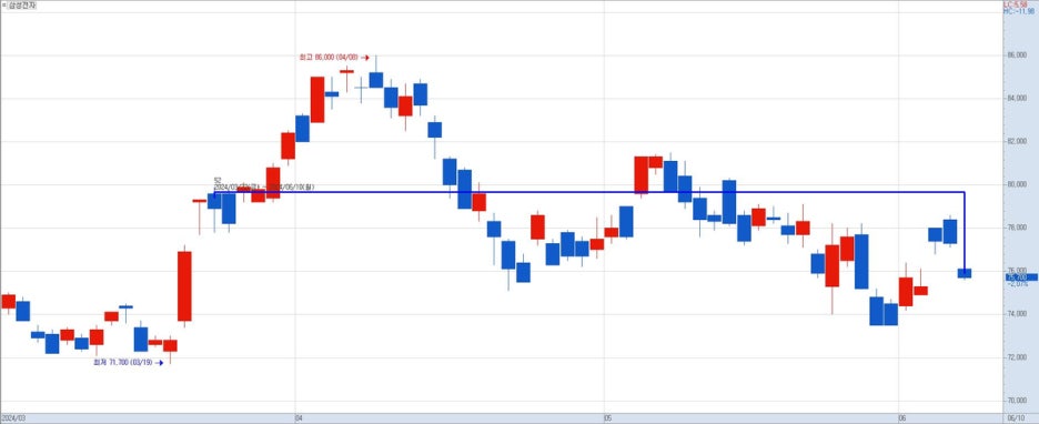 하지만 우리나라 코스피의 20%를 차지하고 있는 삼성전자는 신고가를 경신하지 못하고 있으며 최근 큰 하락을 하였습니다.