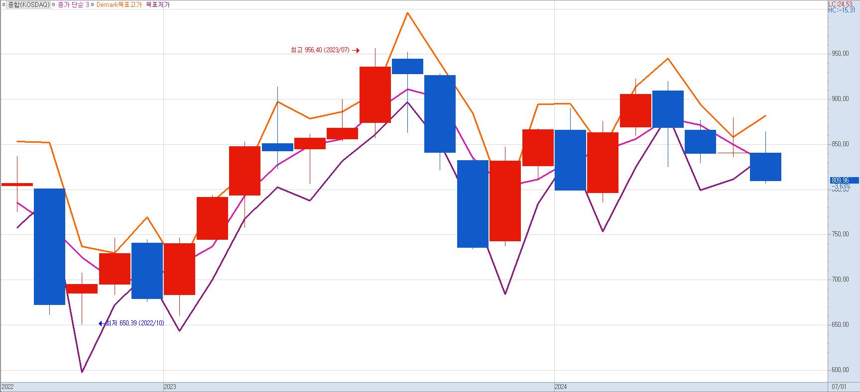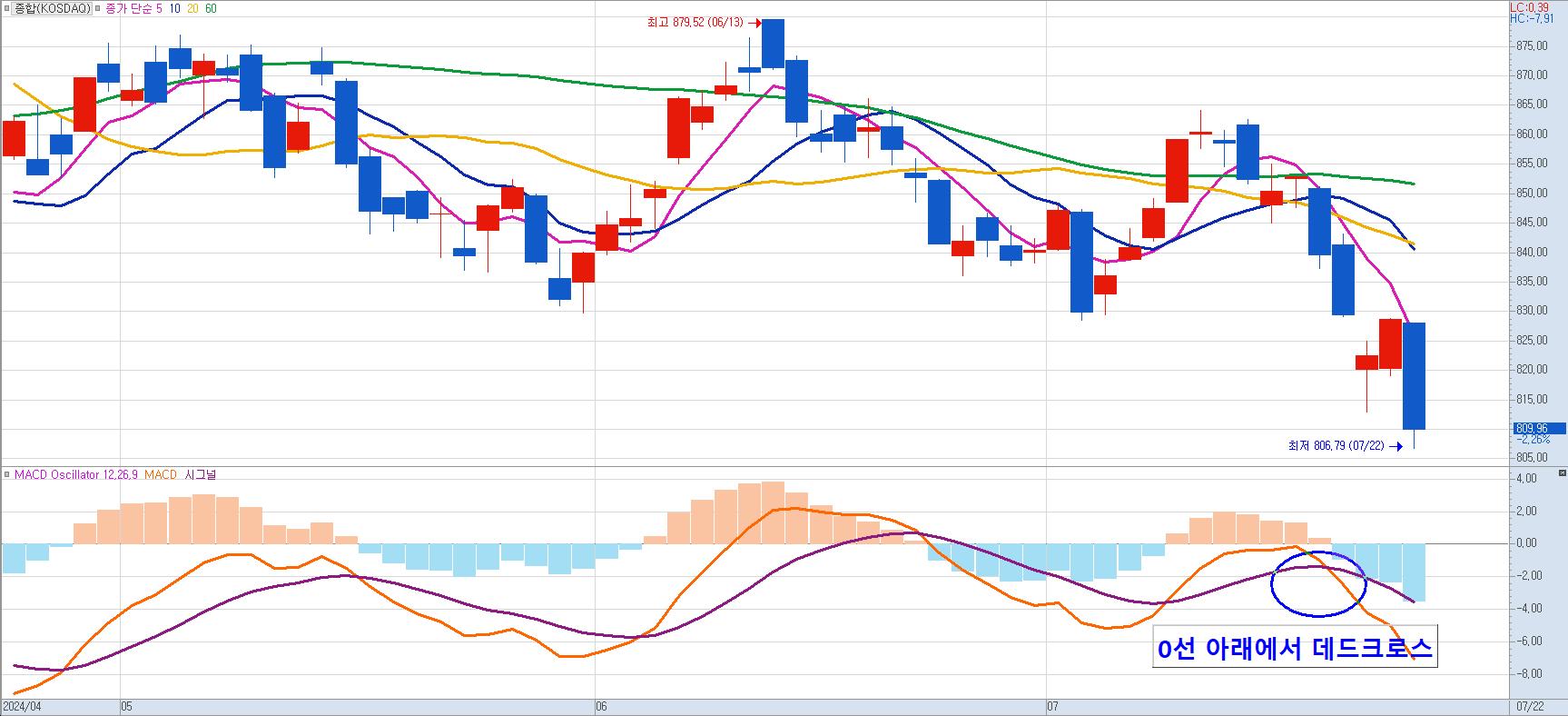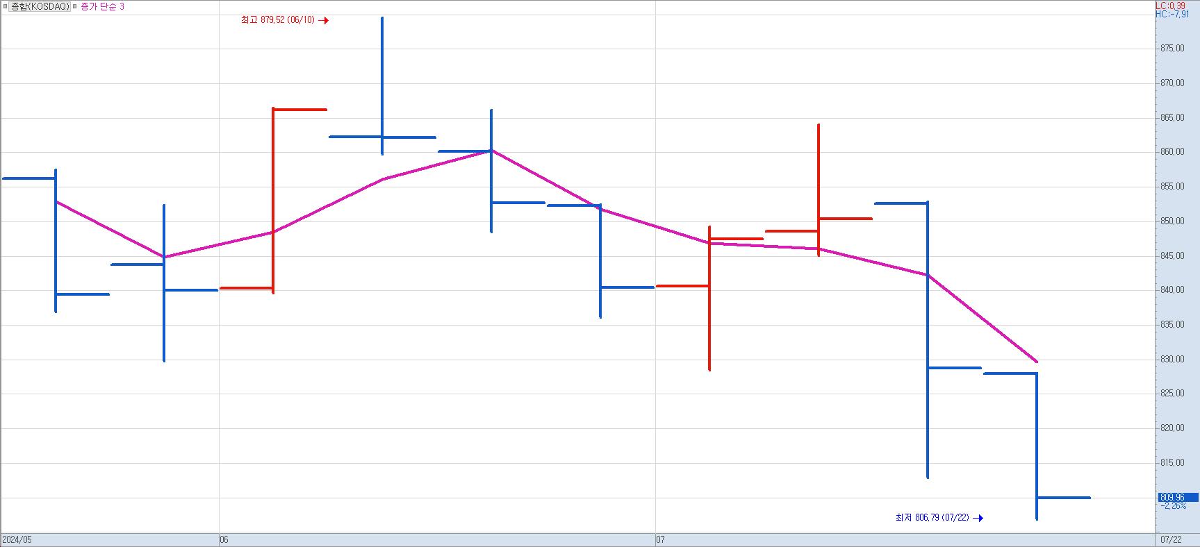 안녕하세요 두 딸 아빠 꽃깜입니다. 이번 시간에는 코스닥 현재 상황에 대해 분석해 보고자 합니다 지금 코스닥 차트를 보면 완전한 하락 추세로 전환된 것으로 보입니다. 7월 22일 기준 60일 신저가를 갱신하여 7월 18일 저가인 812.9를 깨고 장대 음봉을 내며 대세하락으로 전환한 듯 보입니다.