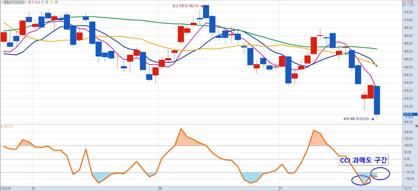 다음은 단기 추세지표인 CCI를 통해 코스닥을 보도록 하겠습니다.