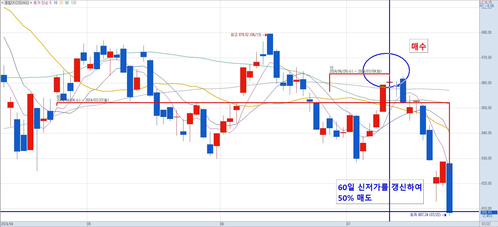 저는 7월 9일 화요일 10일 신고가를 내며 코스닥이 상승하는 걸로 보면서 코스닥 상승 전환으로 판단하여 매수를 하였습니다. 그 이후로 장이 좋지 않아 계속 빠지게 되어 최근 60일 신저가를 내어 금일 50%를 손절하였습니다. 코스닥이 7월 18일부로 지지가 나올 것으로 예상하였으나 미국장이 빠지고, 외국인들의 매도로 인하여 코스피 코스닥이 동시에 하락하였으며 코스피보다 상황이 좋지 않은 코스닥이 더 크게 하락하였다고 볼 수 있습니다.
