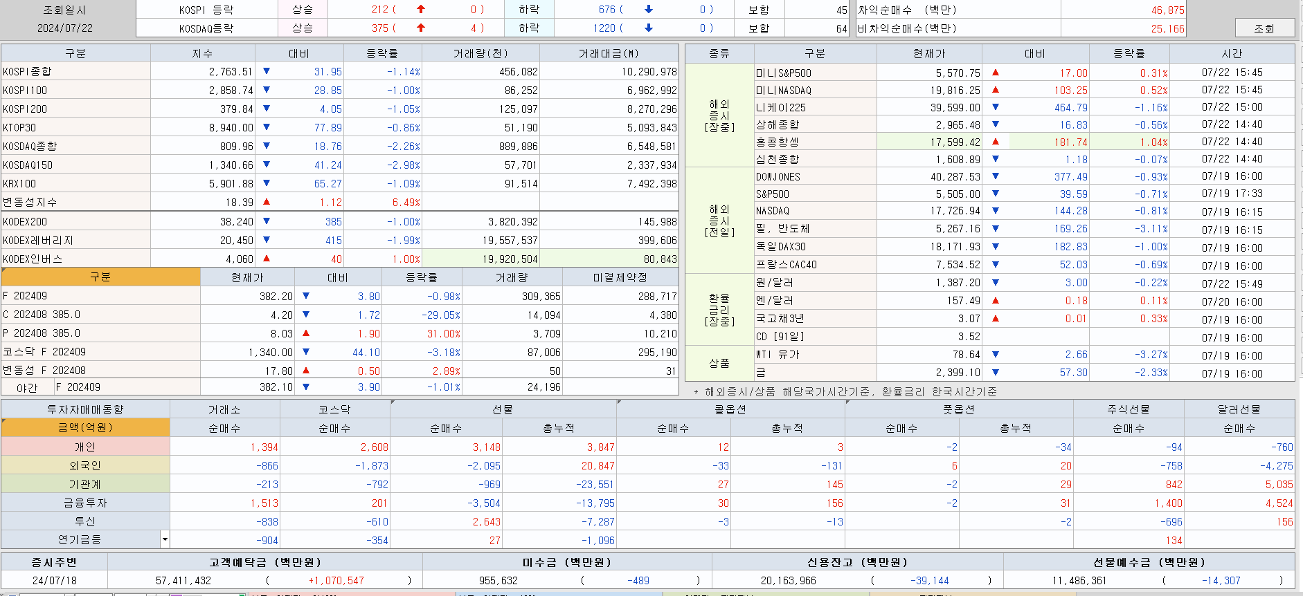 7월 22일 장 종료된 시장 종합을 살펴보면 코스피는 -1.14% , 코스닥은 -2.26% 빠진 상태로 장이 종료되었습니다. 코스피보다 코스닥이 2배 가까이 빠진 것으로 볼 수 있습니다. 그 원인은 외국인들이 코스피 - 866억 코스닥 -1,873원을 정리하면서 코스피와 코스닥이 떨어진 것으로 볼 수 있습니다. 하지만 외국인들이 아직 선물을 2조 넘게 가지고 있는 상황이기 때문에 외국인들의 수급을 예상할 수 있지만 외국인들이 선물을 정리를 조금씩 하고 있기도 하기 때문에 조심해야 합니다. 외국인들이 계속해서 선물을 정리한다면 코스피 지수는 더 빠질 수 있으며 코시피가 빠지는 영향으로 인해 코스닥은 더 크게 빠질 수 있음을 기억하시길 바랍니다.